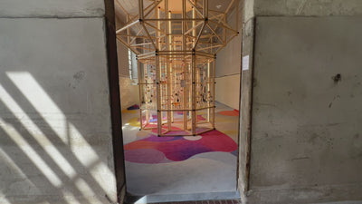 La structure en bois est posée sur un tapis imprimé d’après les visuels microcosmiques de Tania et Vincent.